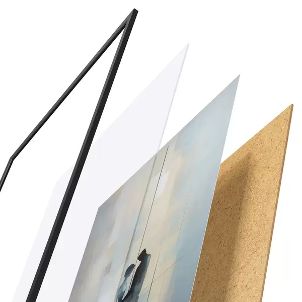 El póster consta de marco, plexiglás, imagen impresa y soporte de aglomerado. El póster puede colgarse inmediatamente en la pared gracias a los soportes de la parte posterior.