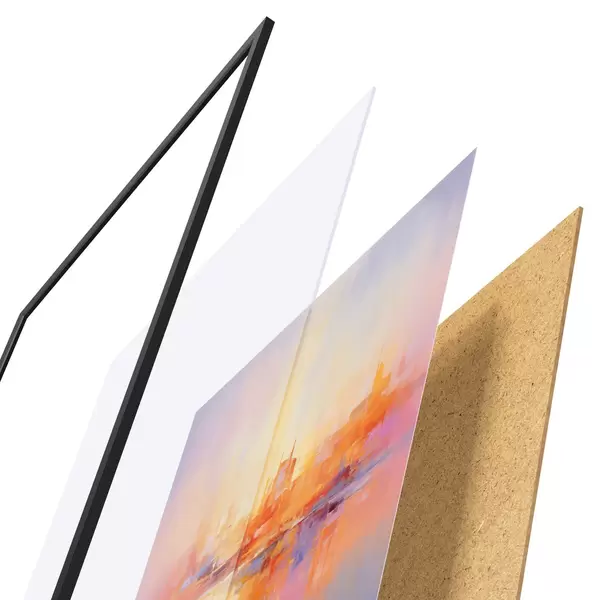 El póster consta de marco, plexiglás, imagen impresa y soporte de aglomerado. El póster puede colgarse inmediatamente en la pared gracias a los soportes de la parte posterior.