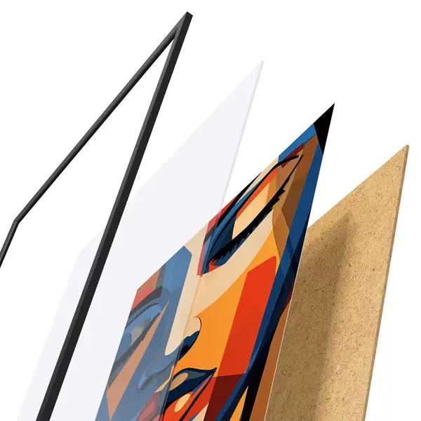 El póster consta de marco, plexiglás, imagen impresa y soporte de aglomerado. El póster puede colgarse inmediatamente en la pared gracias a los soportes de la parte posterior.