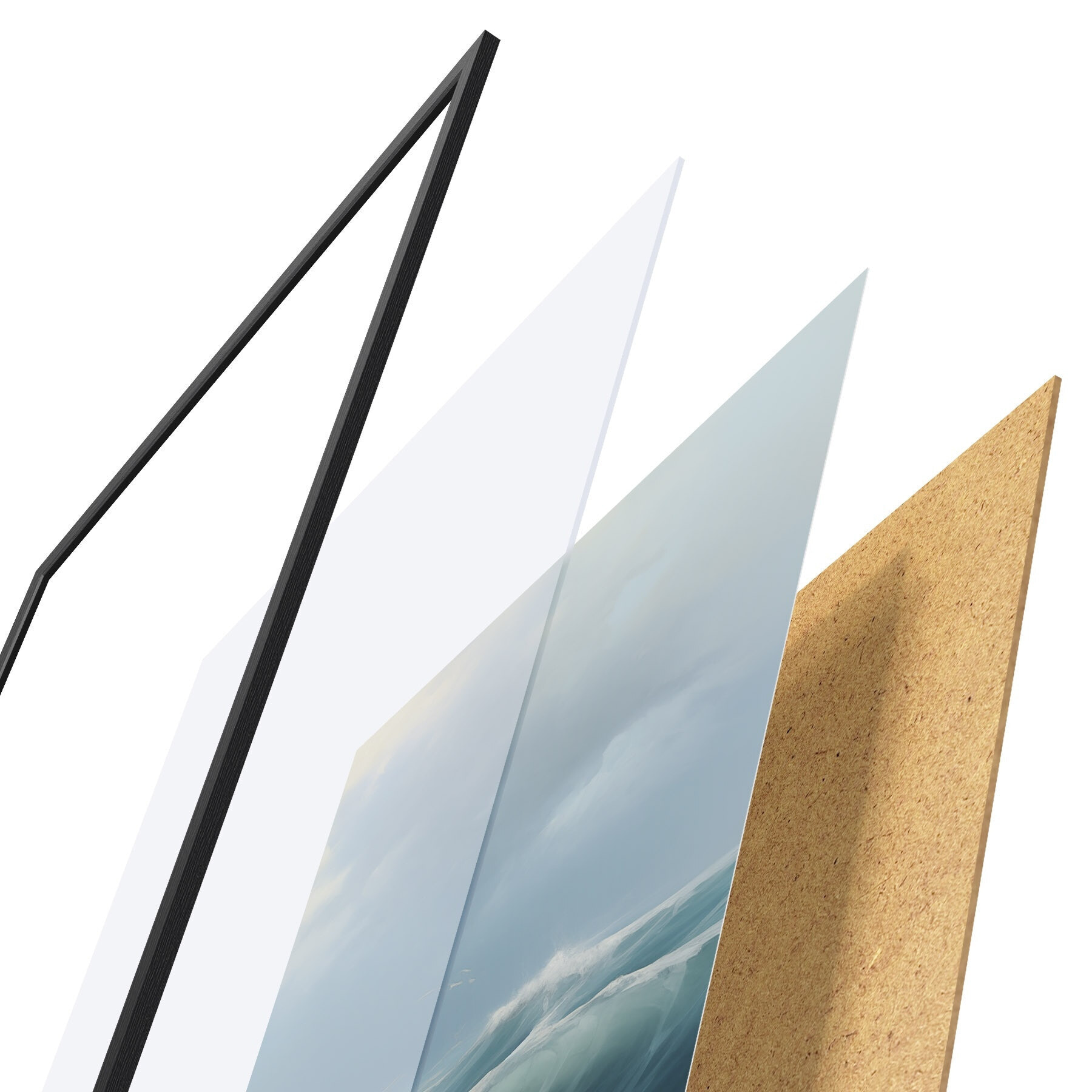 El póster consta de marco, plexiglás, imagen impresa y soporte de aglomerado. El póster puede colgarse inmediatamente en la pared gracias a los soportes de la parte posterior.