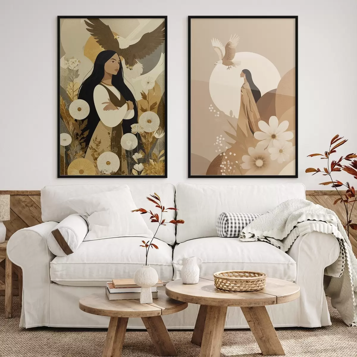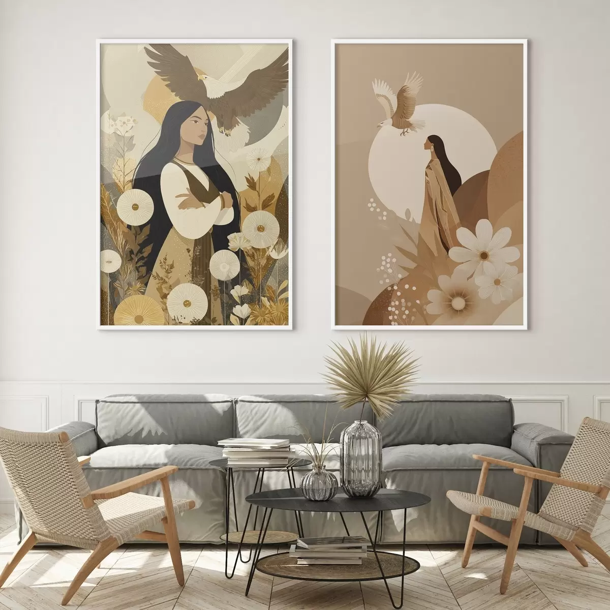 Poster Mujeres con águilas voladoras, estilo tribal, colores beige d00477