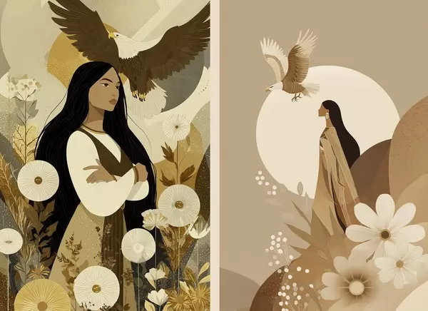 Poster Mujeres con águilas voladoras, estilo tribal, colores beige d00477