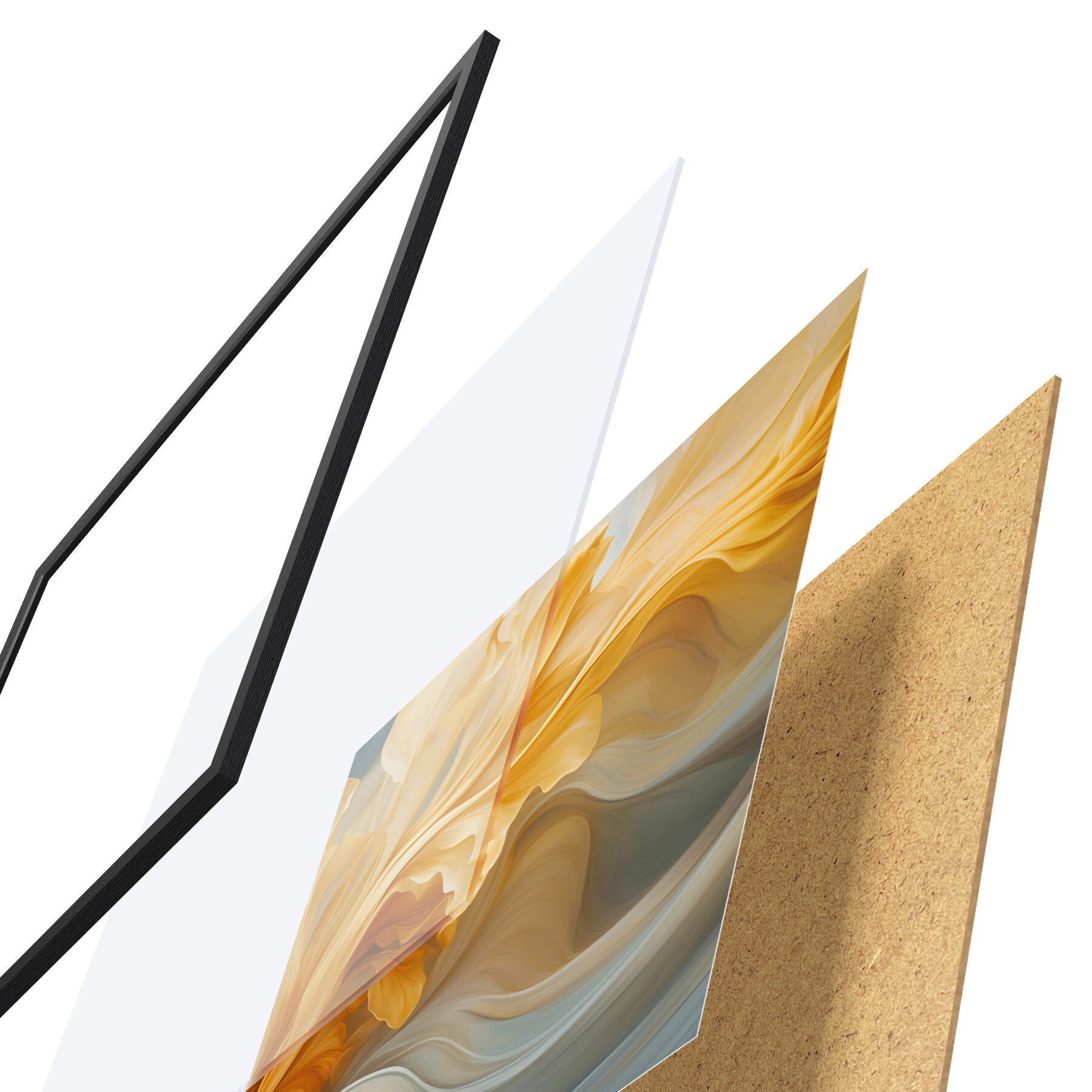 El póster consta de marco, plexiglás, imagen impresa y soporte de aglomerado. El póster puede colgarse inmediatamente en la pared gracias a los soportes de la parte posterior.