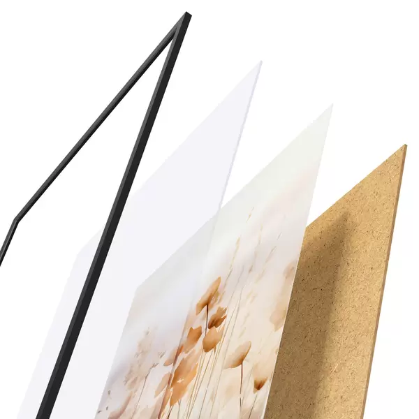 El póster consta de marco, plexiglás, imagen impresa y soporte de aglomerado. El póster puede colgarse inmediatamente en la pared gracias a los soportes de la parte posterior.