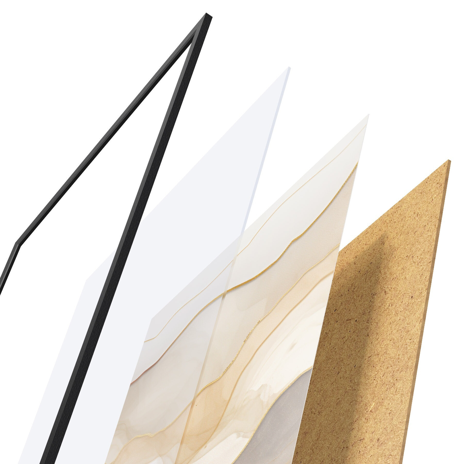 El póster consta de marco, plexiglás, imagen impresa y soporte de aglomerado. El póster puede colgarse inmediatamente en la pared gracias a los soportes de la parte posterior.