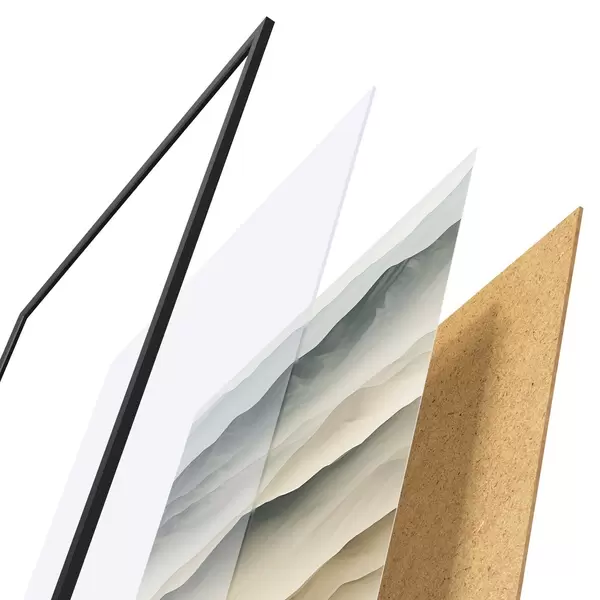 El póster consta de marco, plexiglás, imagen impresa y soporte de aglomerado. El póster puede colgarse inmediatamente en la pared gracias a los soportes de la parte posterior.