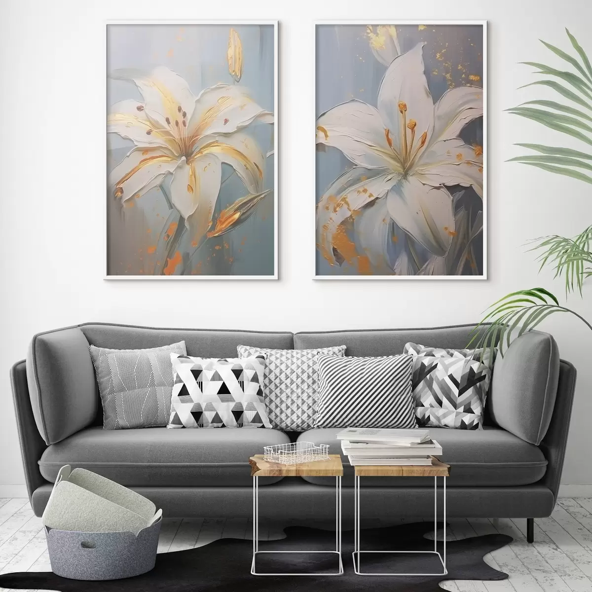 Poster Lirios blancos con trazos amarillos sobre fondo azul Nr d00497