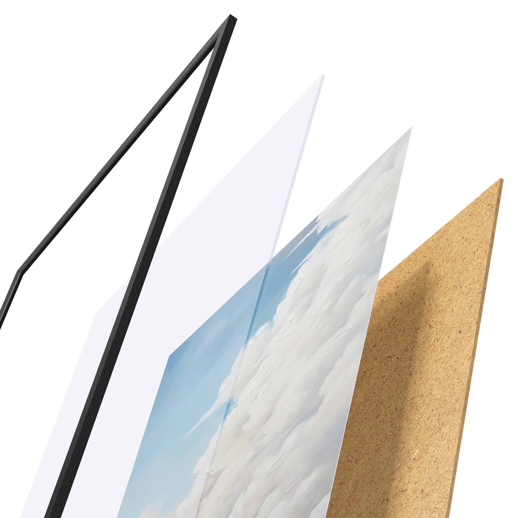 El póster consta de marco, plexiglás, imagen impresa y soporte de aglomerado. El póster puede colgarse inmediatamente en la pared gracias a los soportes de la parte posterior.