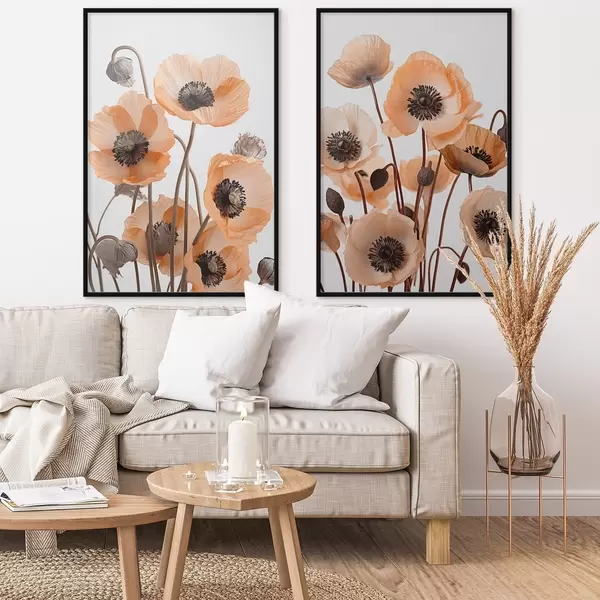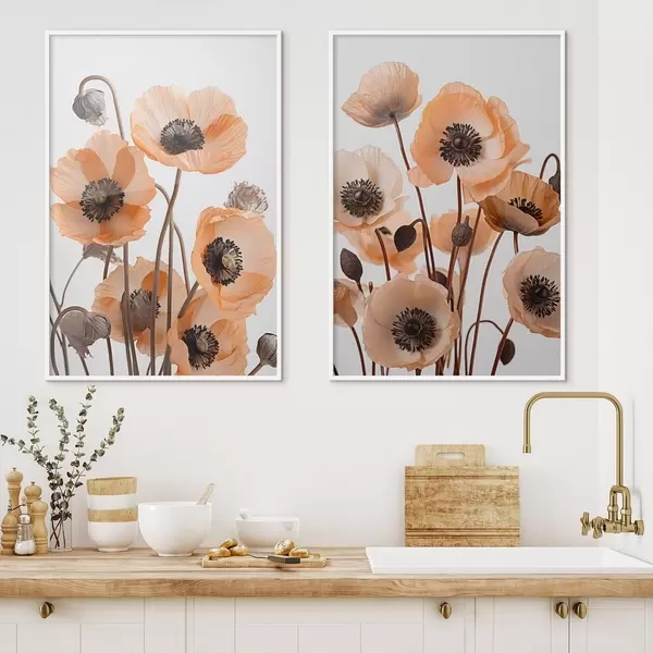 Poster Amapolas naranjas, flores secas sobre fondo claro, iluminación suave, pétalos delicados, arreglo floral Nr d00518