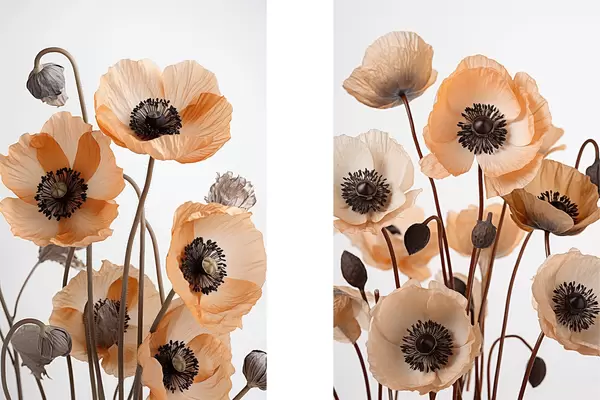 Poster Amapolas naranjas, flores secas sobre fondo claro, iluminación suave, pétalos delicados, arreglo floral d00518