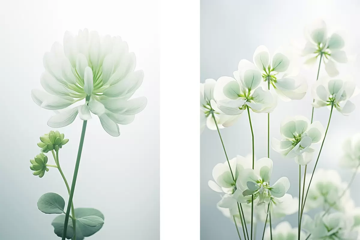 Poster Flores de trébol blanco con tallo y hojas verdes, iluminación suave, fondo limpio, composición minimalista, botánica Nr d00520