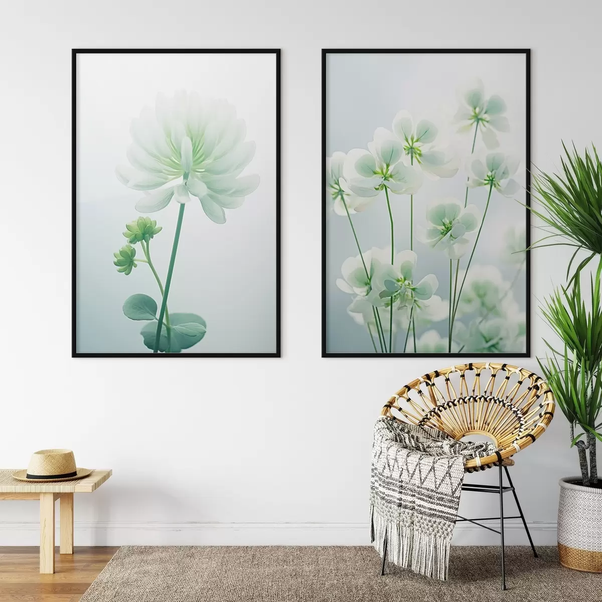 Poster Flores de trébol blanco con tallo y hojas verdes, iluminación suave, fondo limpio, composición minimalista, botánica d00520