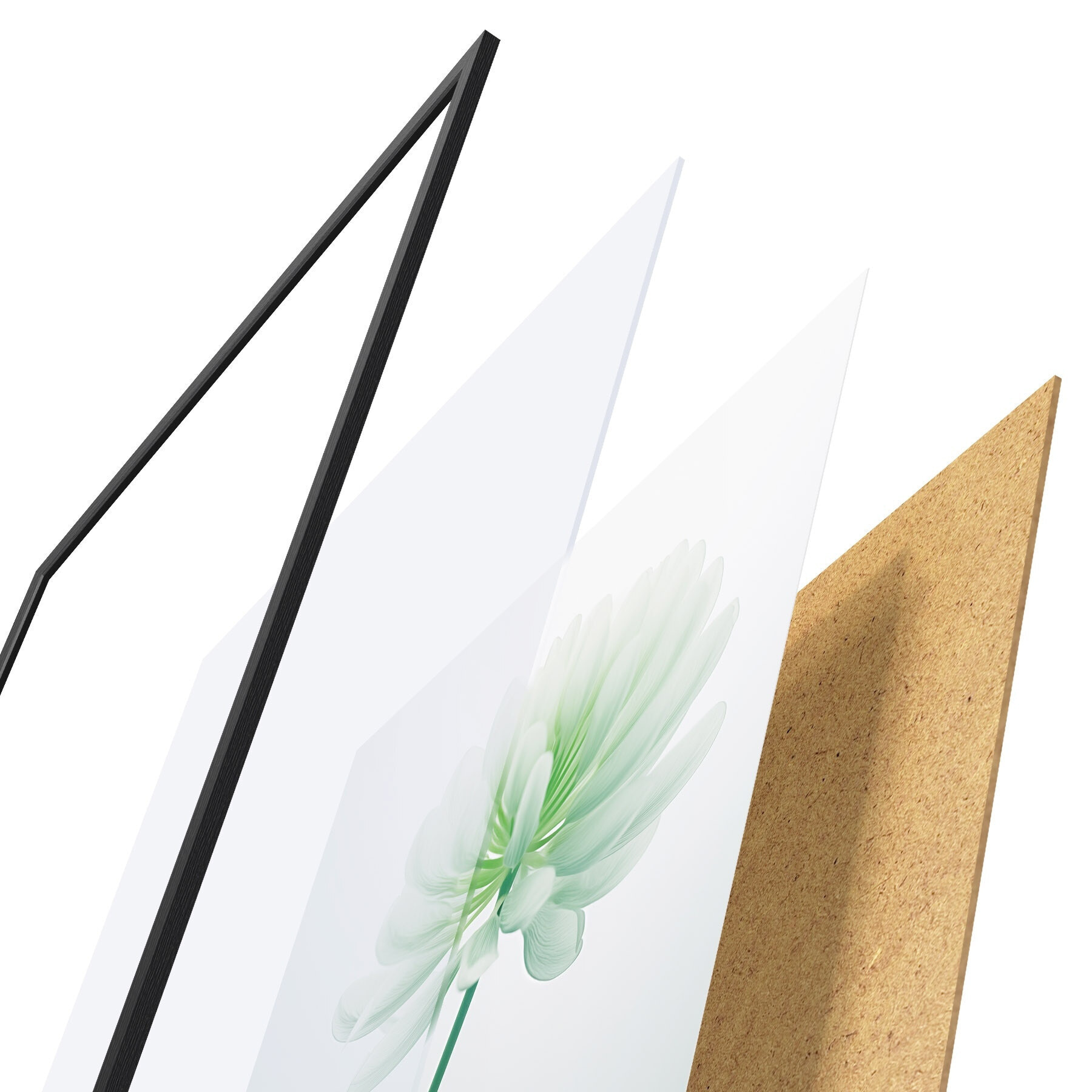 El póster consta de marco, plexiglás, imagen impresa y soporte de aglomerado. El póster puede colgarse inmediatamente en la pared gracias a los soportes de la parte posterior.