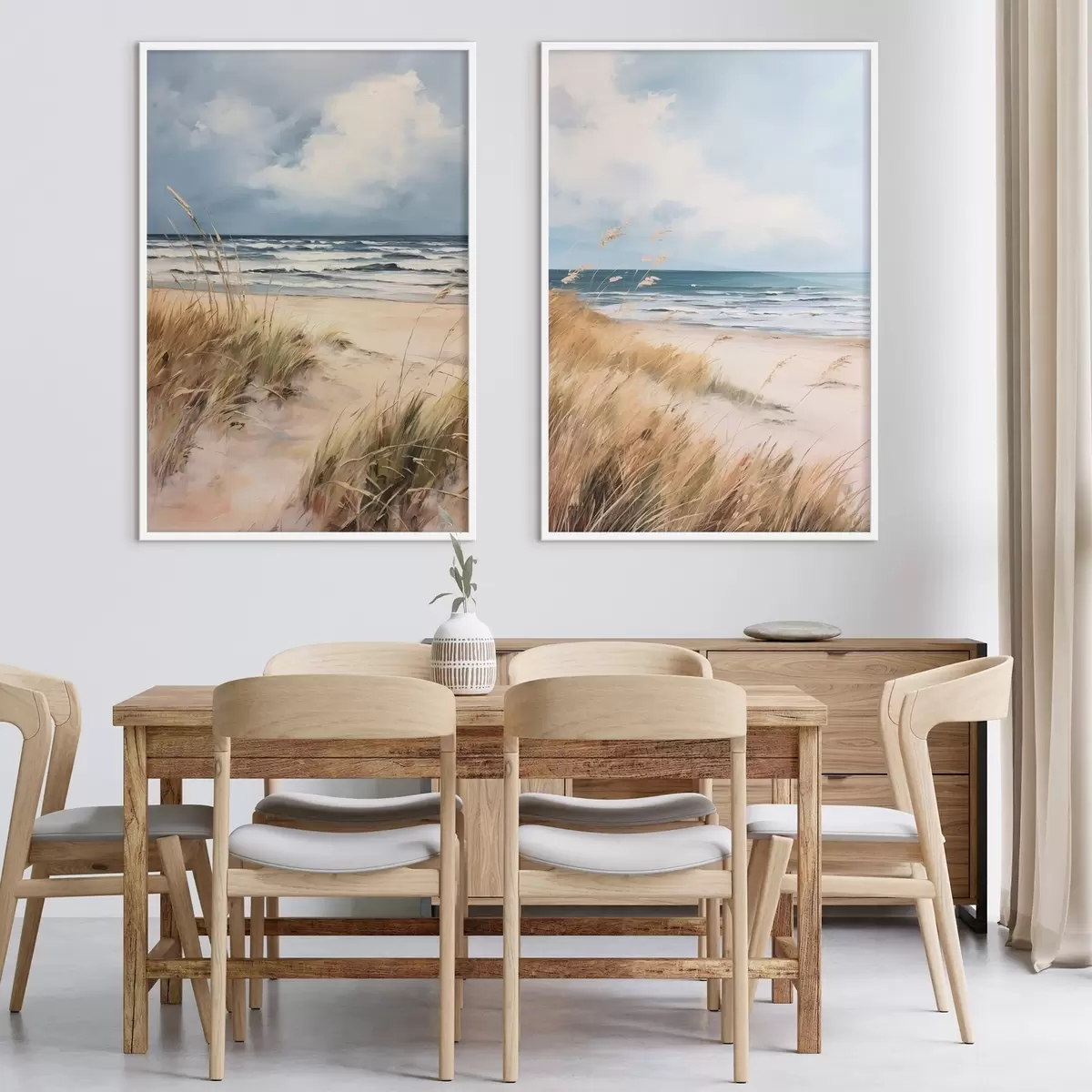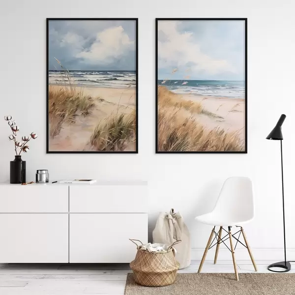 Poster Una playa de arena con hierba alta en primer plano, el océano con olas y un cielo nublado al fondo Nr d00521