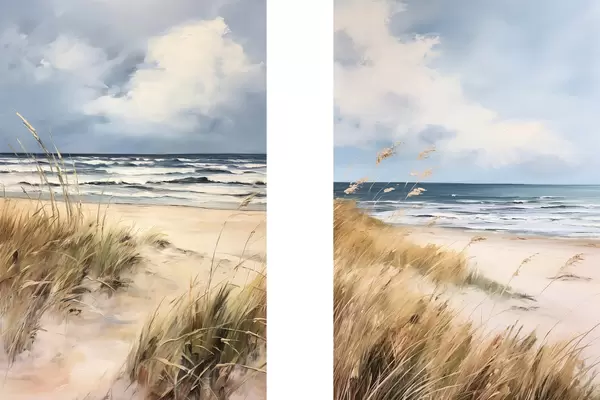 Poster Una playa de arena con hierba alta en primer plano, el océano con olas y un cielo nublado al fondo Nr d00521