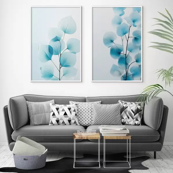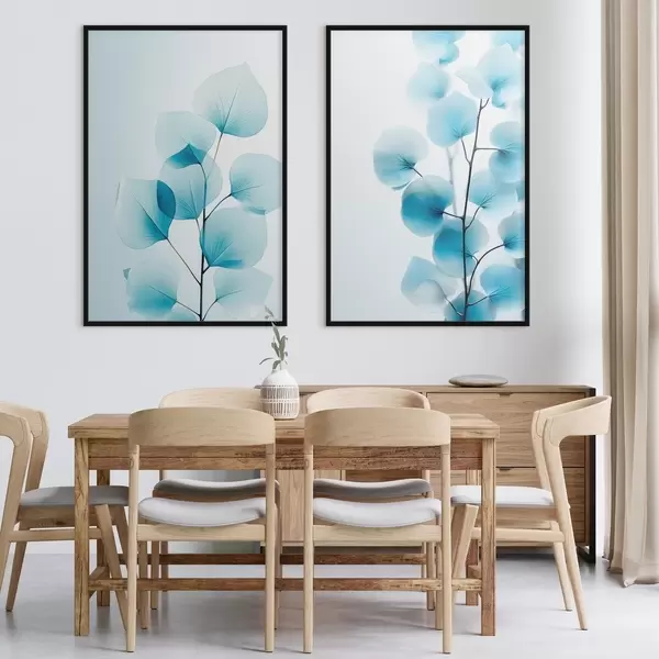 Poster Rama con hojas azul translúcido, delicadas venas visibles, composición ligera y tranquila, estética minimalista Nr d00522