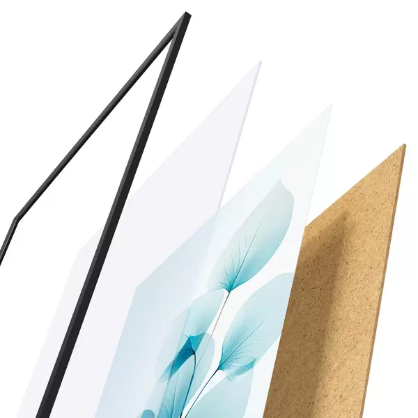 El póster consta de marco, plexiglás, imagen impresa y soporte de aglomerado. El póster puede colgarse inmediatamente en la pared gracias a los soportes de la parte posterior.