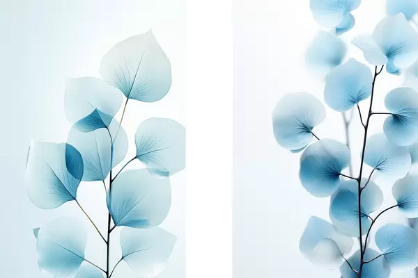 Poster Rama con hojas azul translúcido, delicadas venas visibles, composición ligera y tranquila, estética minimalista Nr d00522