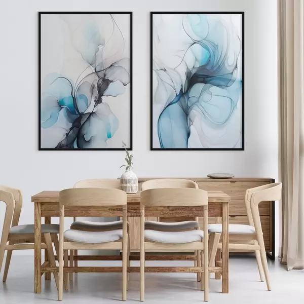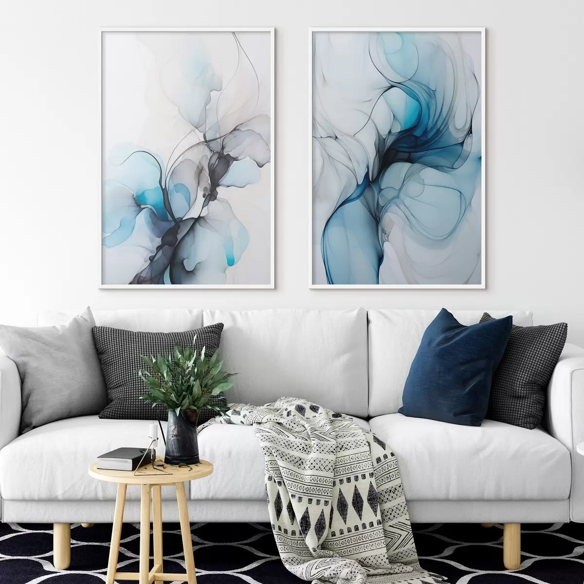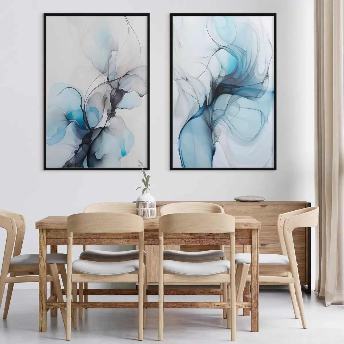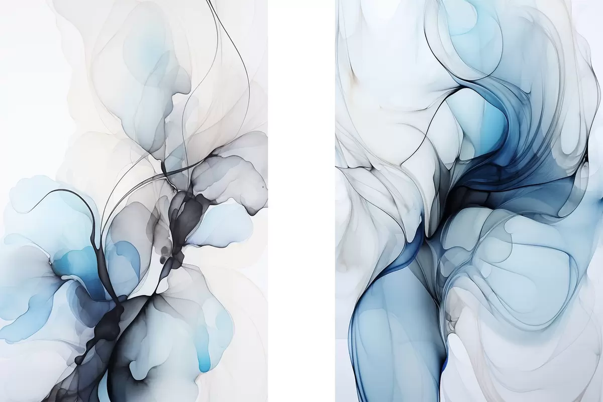 Poster Composición abstracta con líneas fluidas y pétalos translúcidos en tonos azul blanco y beige, imitación de tinta de alcohol Nr d00523
