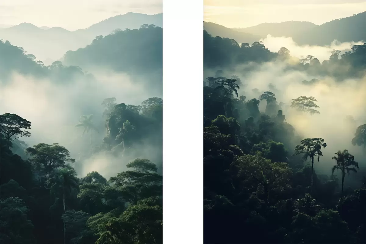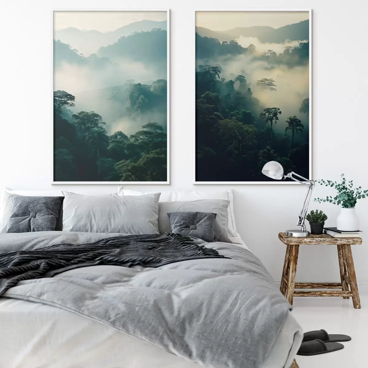Poster Selva tropical con frondosos árboles verdes y una espesa capa de niebla , creando un ambiente atmosférico Nr d00529
