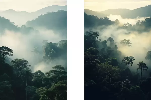 Poster Selva tropical con frondosos árboles verdes y una espesa capa de niebla , creando un ambiente atmosférico d00529