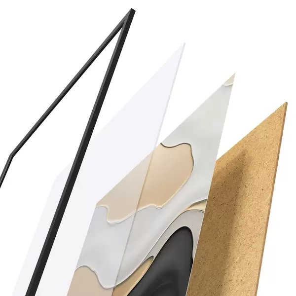 El póster consta de marco, plexiglás, imagen impresa y soporte de aglomerado. El póster puede colgarse inmediatamente en la pared gracias a los soportes de la parte posterior.