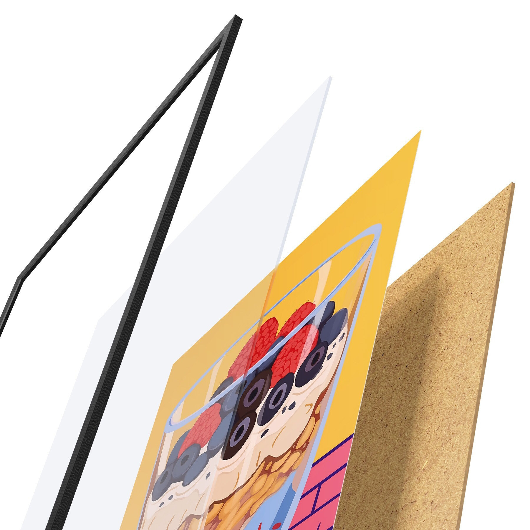 El póster consta de marco, plexiglás, imagen impresa y soporte de aglomerado. El póster puede colgarse inmediatamente en la pared gracias a los soportes de la parte posterior.