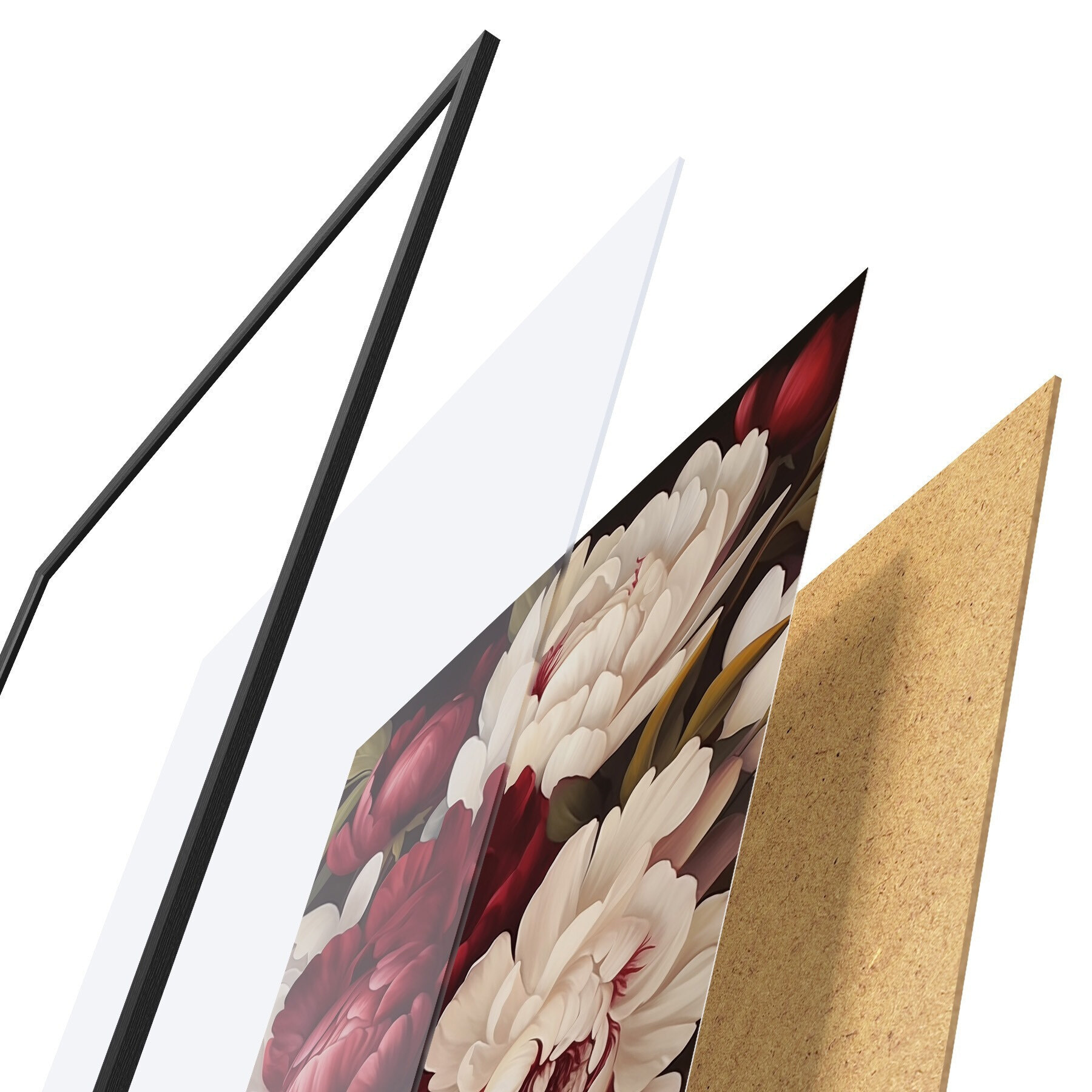 El póster consta de marco, plexiglás, imagen impresa y soporte de aglomerado. El póster puede colgarse inmediatamente en la pared gracias a los soportes de la parte posterior.