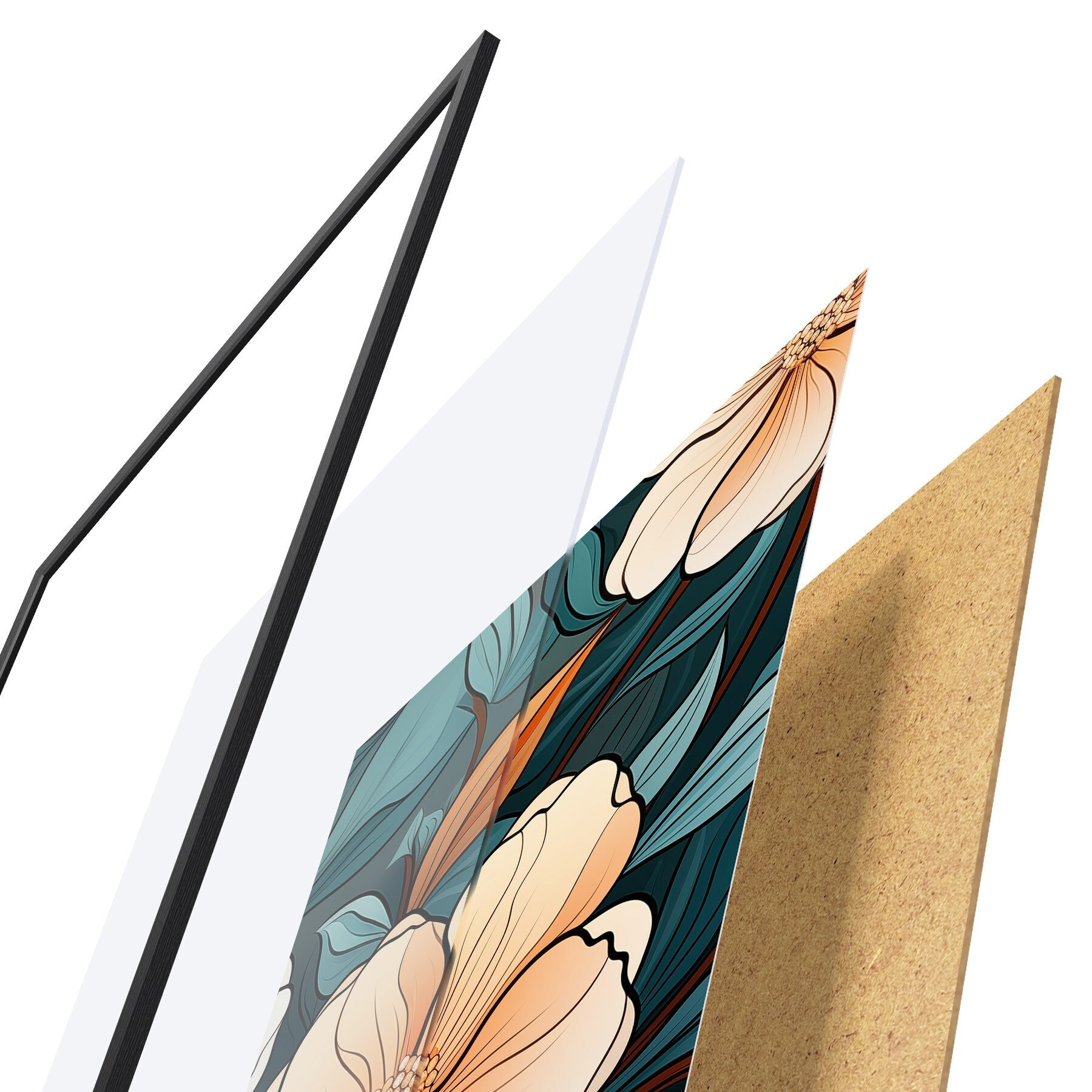 El póster consta de marco, plexiglás, imagen impresa y soporte de aglomerado. El póster puede colgarse inmediatamente en la pared gracias a los soportes de la parte posterior.