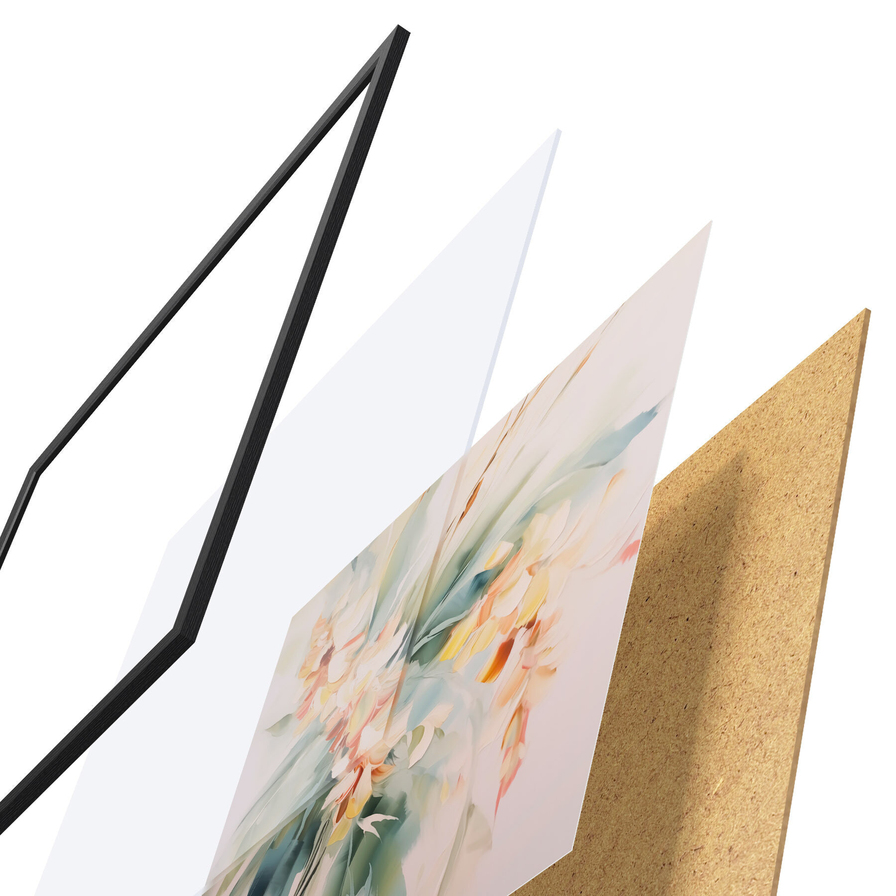El póster consta de marco, plexiglás, imagen impresa y soporte de aglomerado. El póster puede colgarse inmediatamente en la pared gracias a los soportes de la parte posterior.