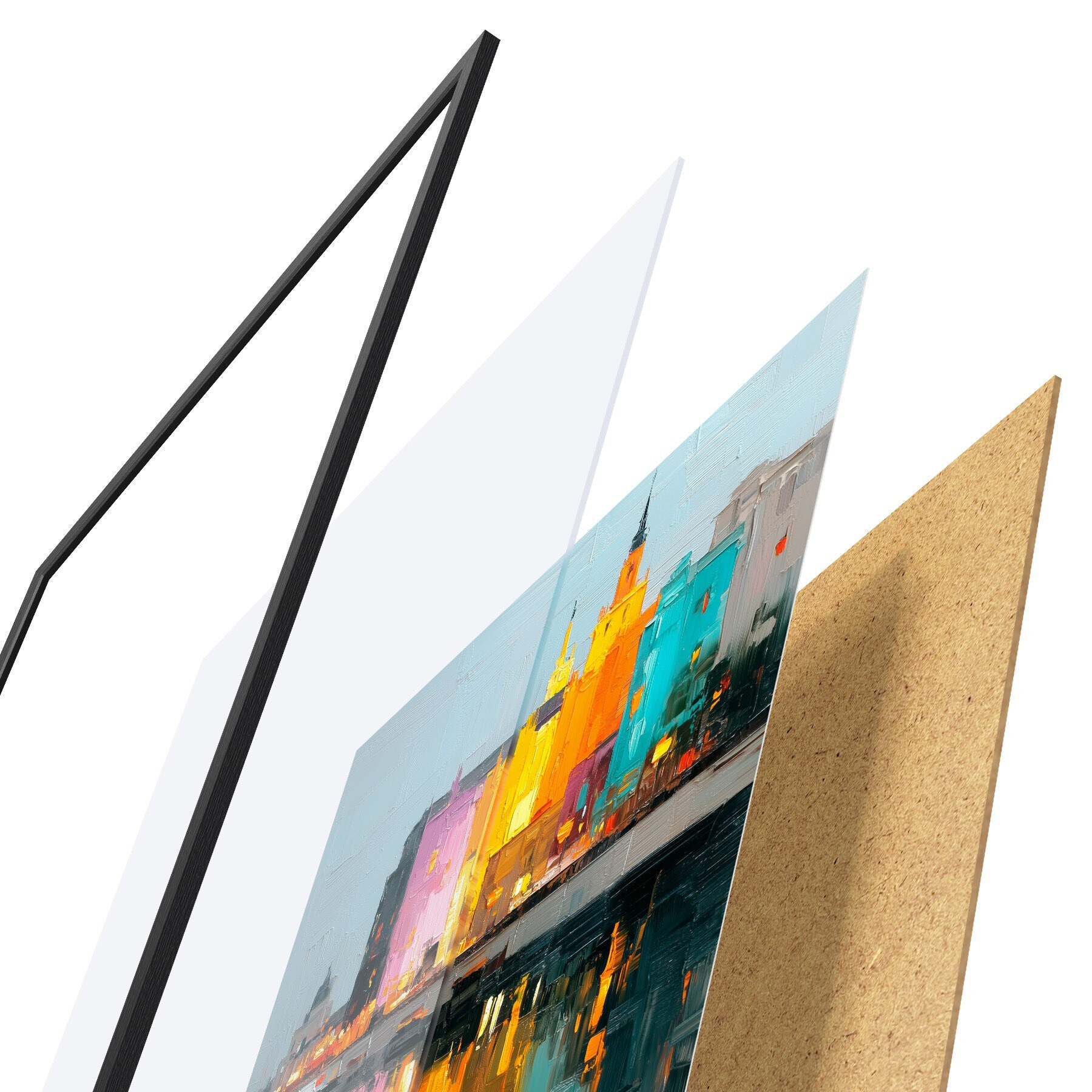 El póster consta de marco, plexiglás, imagen impresa y soporte de aglomerado. El póster puede colgarse inmediatamente en la pared gracias a los soportes de la parte posterior.