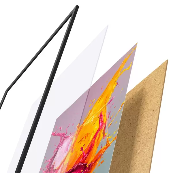 El póster consta de marco, plexiglás, imagen impresa y soporte de aglomerado. El póster puede colgarse inmediatamente en la pared gracias a los soportes de la parte posterior.