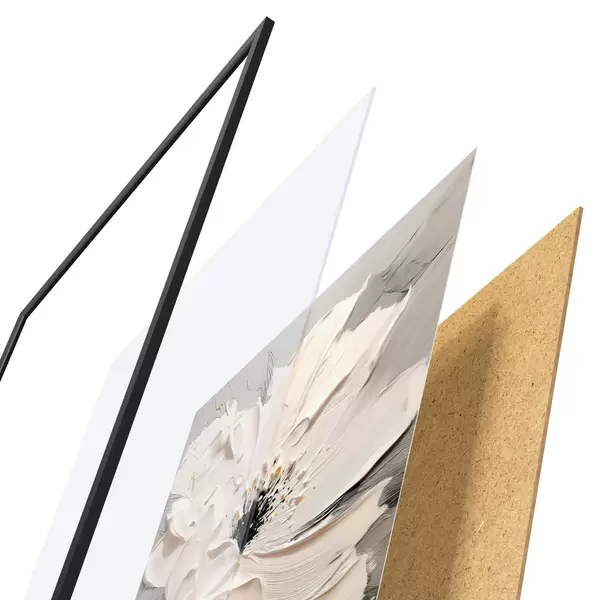 El póster consta de marco, plexiglás, imagen impresa y soporte de aglomerado. El póster puede colgarse inmediatamente en la pared gracias a los soportes de la parte posterior.