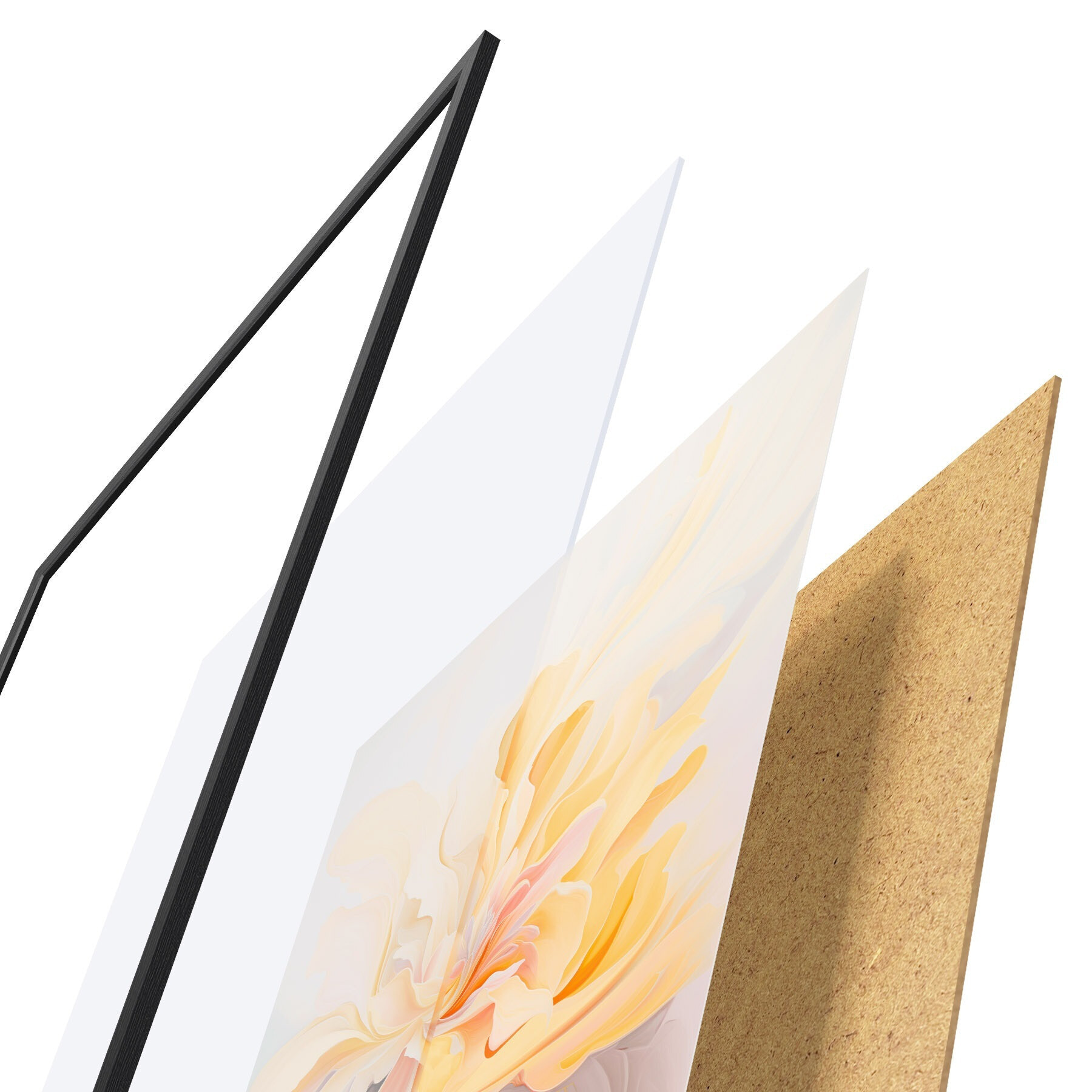 El póster consta de marco, plexiglás, imagen impresa y soporte de aglomerado. El póster puede colgarse inmediatamente en la pared gracias a los soportes de la parte posterior.