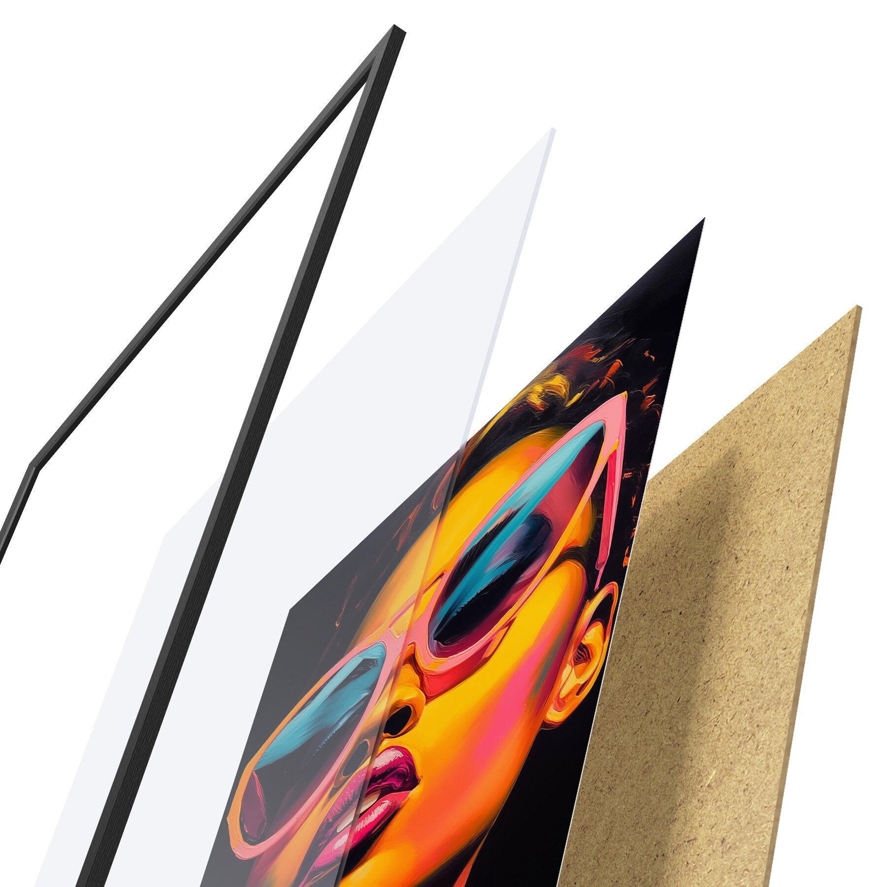 El póster consta de marco, plexiglás, imagen impresa y soporte de aglomerado. El póster puede colgarse inmediatamente en la pared gracias a los soportes de la parte posterior.