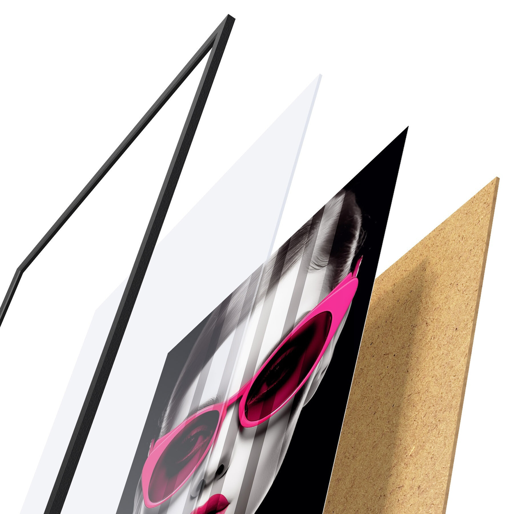 El póster consta de marco, plexiglás, imagen impresa y soporte de aglomerado. El póster puede colgarse inmediatamente en la pared gracias a los soportes de la parte posterior.