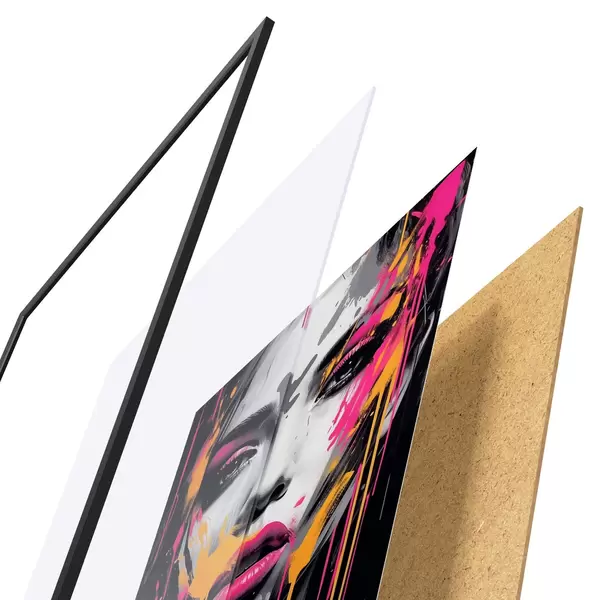 El póster consta de marco, plexiglás, imagen impresa y soporte de aglomerado. El póster puede colgarse inmediatamente en la pared gracias a los soportes de la parte posterior.