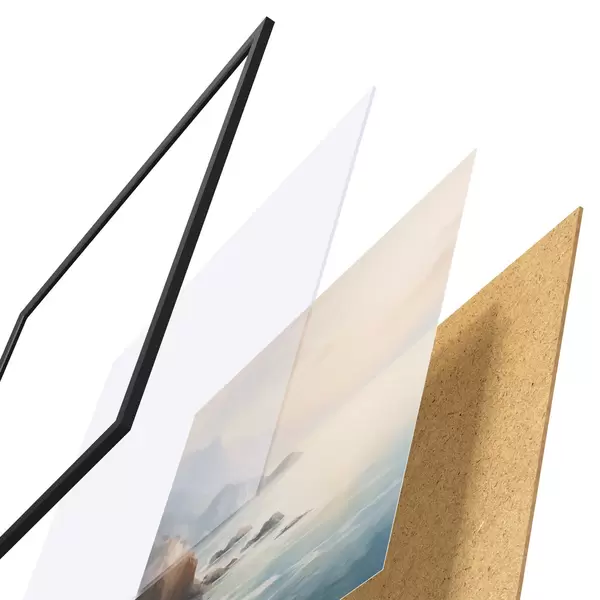 El póster consta de marco, plexiglás, imagen impresa y soporte de aglomerado. El póster puede colgarse inmediatamente en la pared gracias a los soportes de la parte posterior.