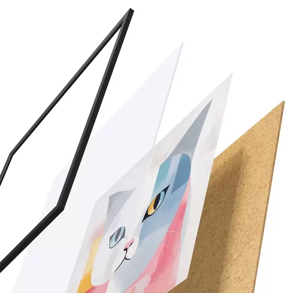 El póster consta de marco, plexiglás, imagen impresa y soporte de aglomerado. El póster puede colgarse inmediatamente en la pared gracias a los soportes de la parte posterior.