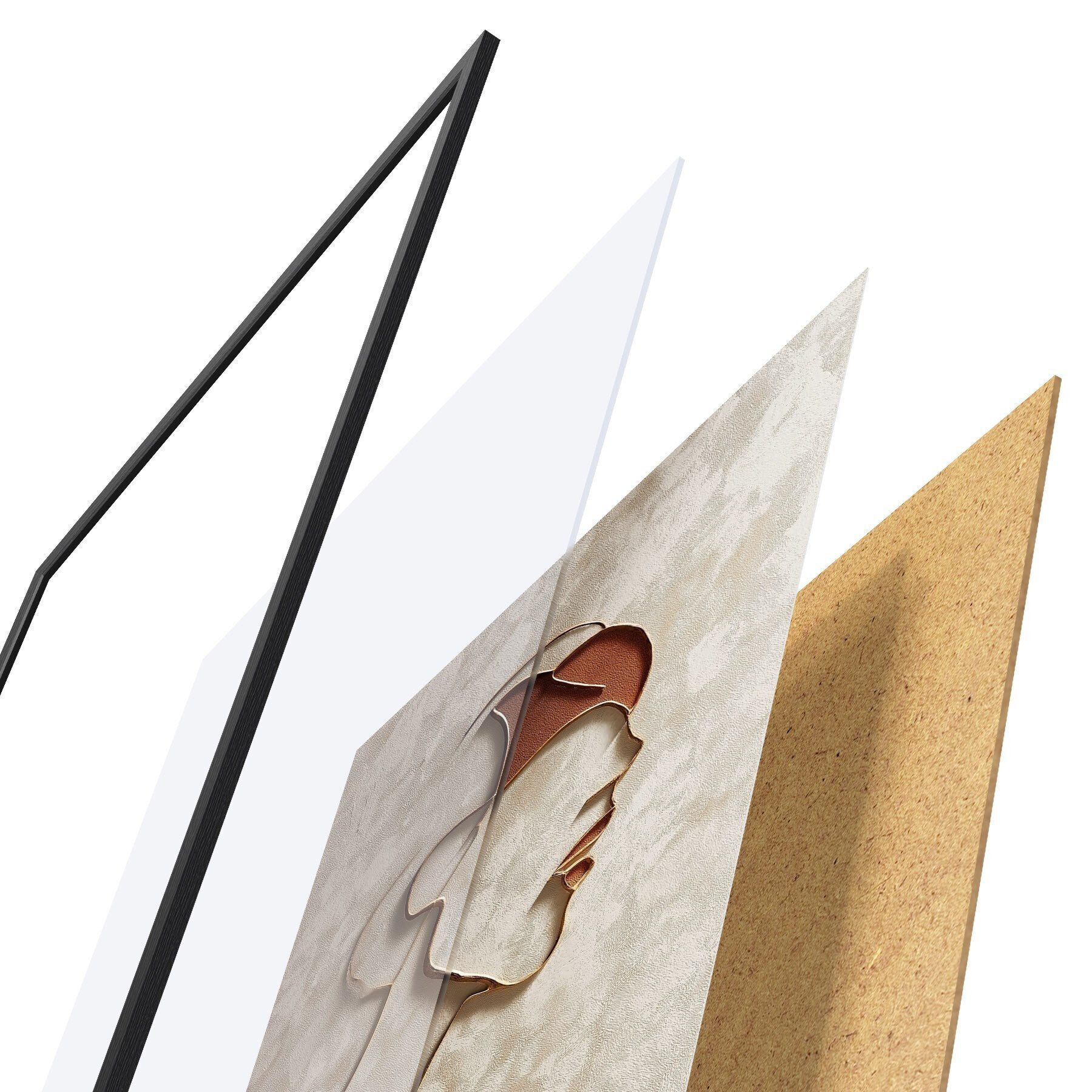 El póster consta de marco, plexiglás, imagen impresa y soporte de aglomerado. El póster puede colgarse inmediatamente en la pared gracias a los soportes de la parte posterior.