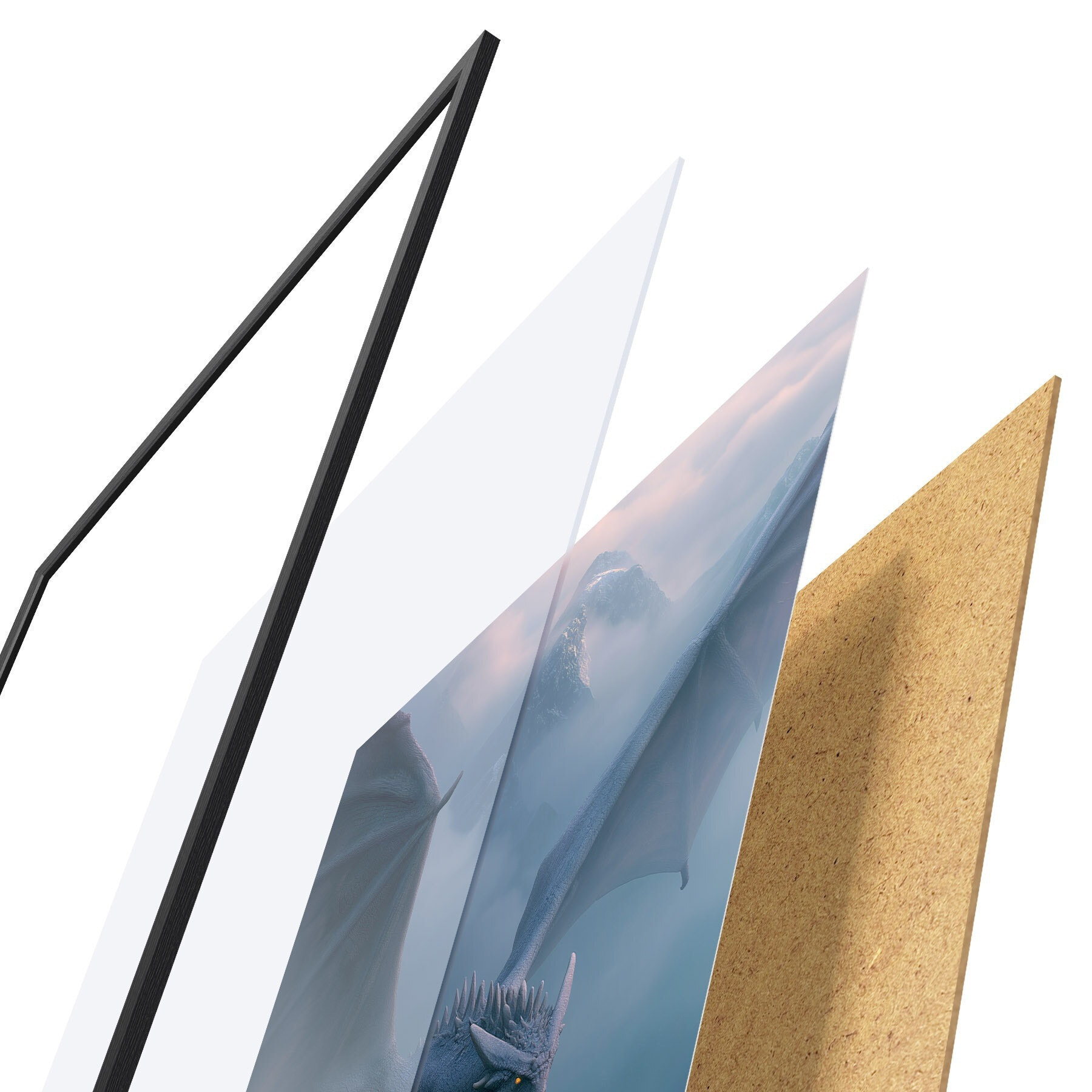El póster consta de marco, plexiglás, imagen impresa y soporte de aglomerado. El póster puede colgarse inmediatamente en la pared gracias a los soportes de la parte posterior.