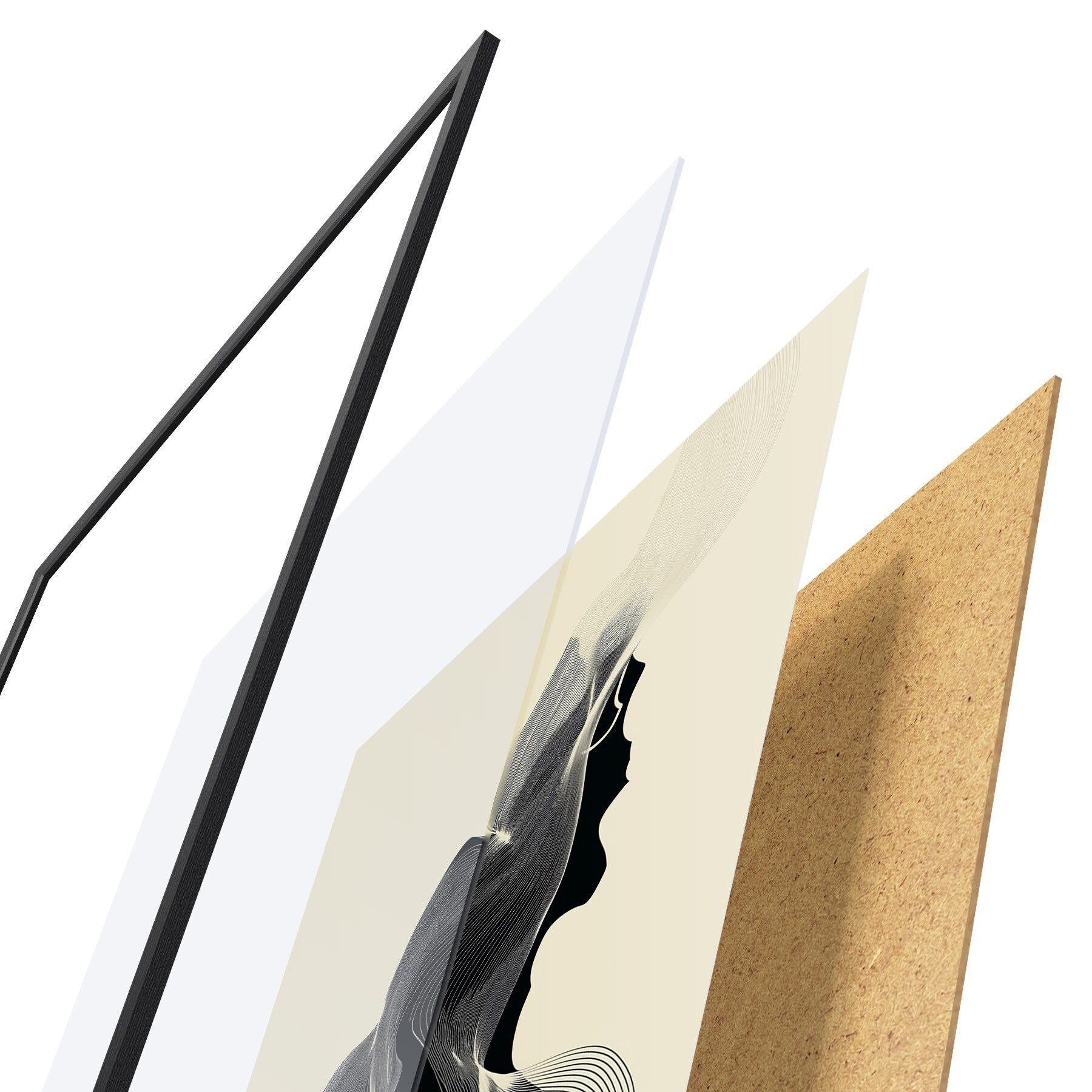 El póster consta de marco, plexiglás, imagen impresa y soporte de aglomerado. El póster puede colgarse inmediatamente en la pared gracias a los soportes de la parte posterior.