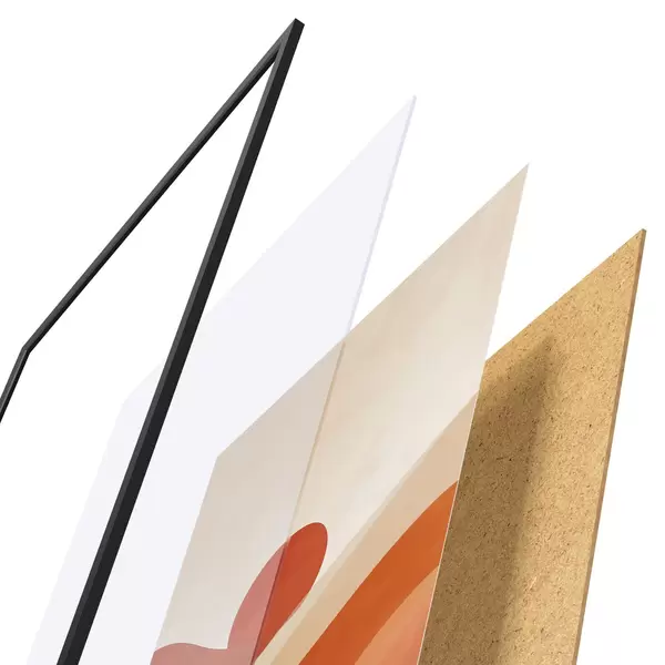 El póster consta de marco, plexiglás, imagen impresa y soporte de aglomerado. El póster puede colgarse inmediatamente en la pared gracias a los soportes de la parte posterior.