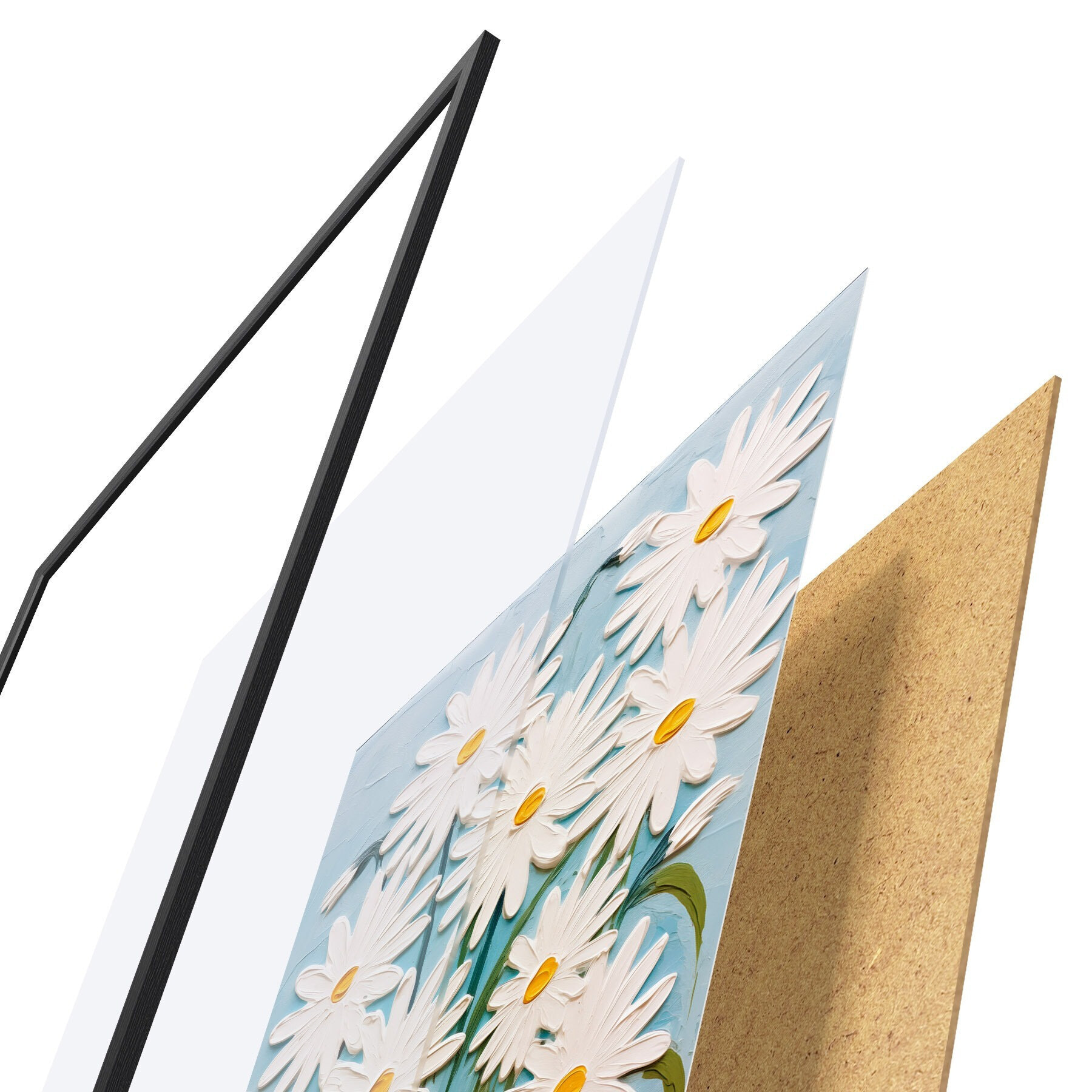 El póster consta de marco, plexiglás, imagen impresa y soporte de aglomerado. El póster puede colgarse inmediatamente en la pared gracias a los soportes de la parte posterior.