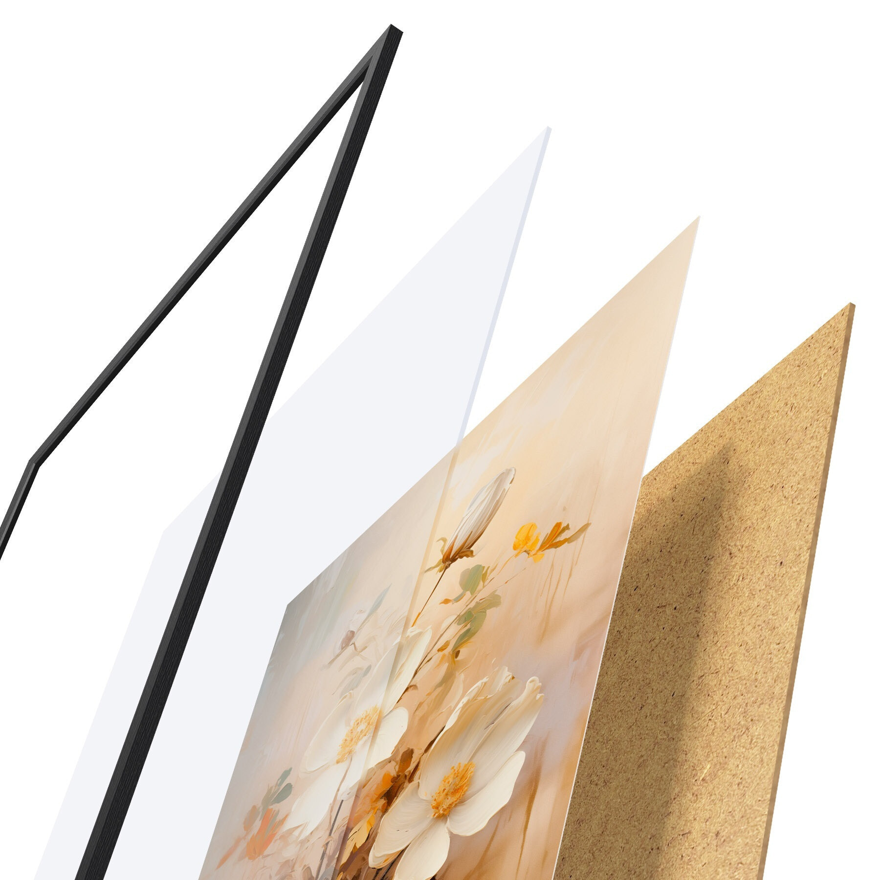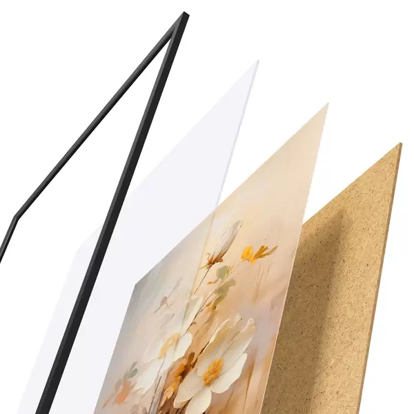 El póster consta de marco, plexiglás, imagen impresa y soporte de aglomerado. El póster puede colgarse inmediatamente en la pared gracias a los soportes de la parte posterior.