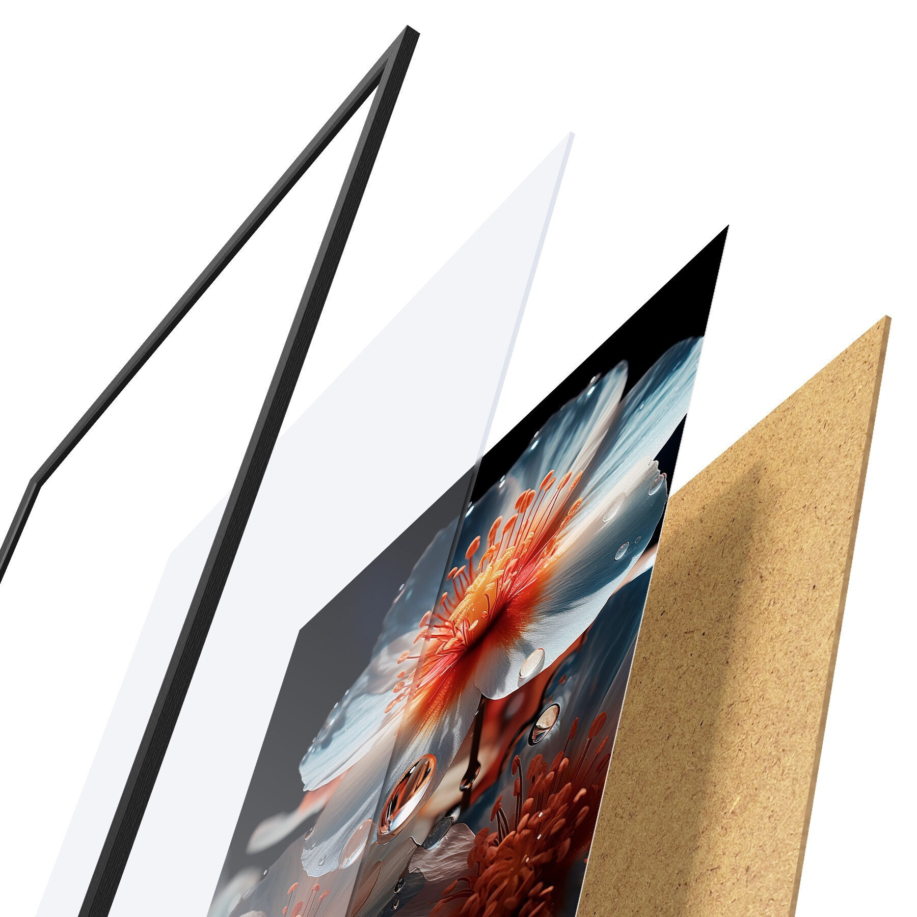 El póster consta de marco, plexiglás, imagen impresa y soporte de aglomerado. El póster puede colgarse inmediatamente en la pared gracias a los soportes de la parte posterior.