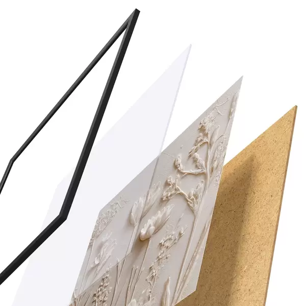 El póster consta de marco, plexiglás, imagen impresa y soporte de aglomerado. El póster puede colgarse inmediatamente en la pared gracias a los soportes de la parte posterior.