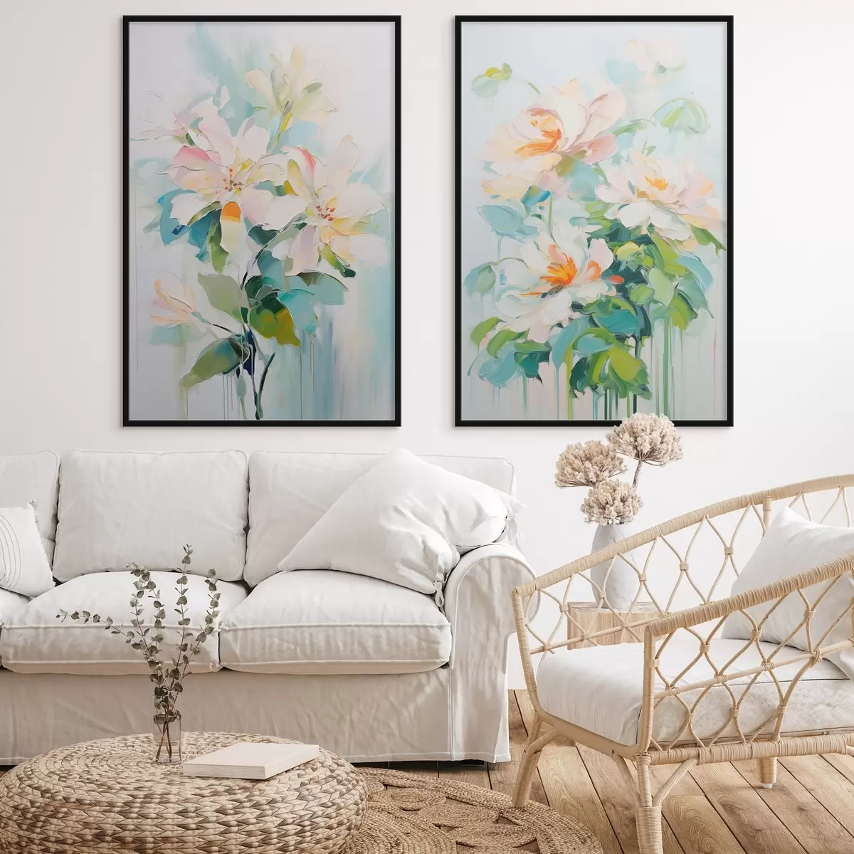 Poster Flores blancas y pastel melocotón, hojas verdes, pinceladas suaves imitación pintura al óleo, fondo azul claro d00644