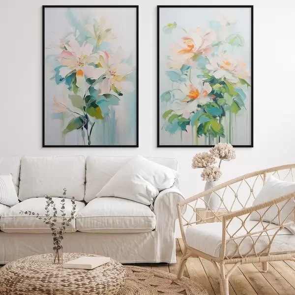 Poster Flores blancas y pastel melocotón, hojas verdes, pinceladas suaves imitación pintura al óleo, fondo azul claro Nr d00644