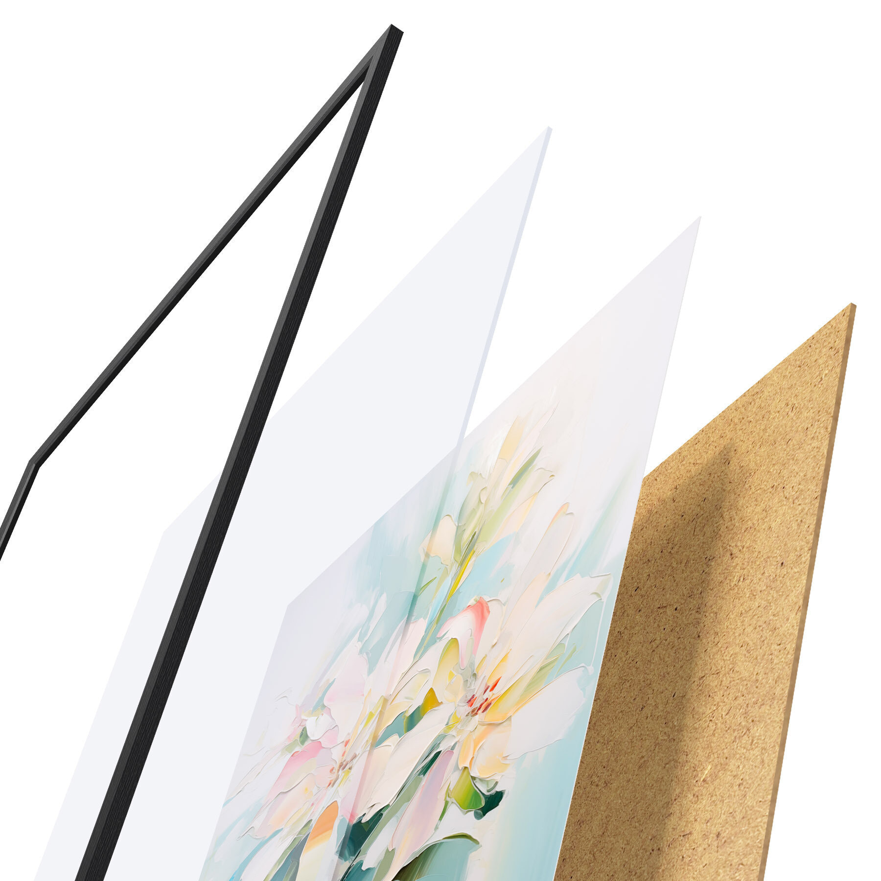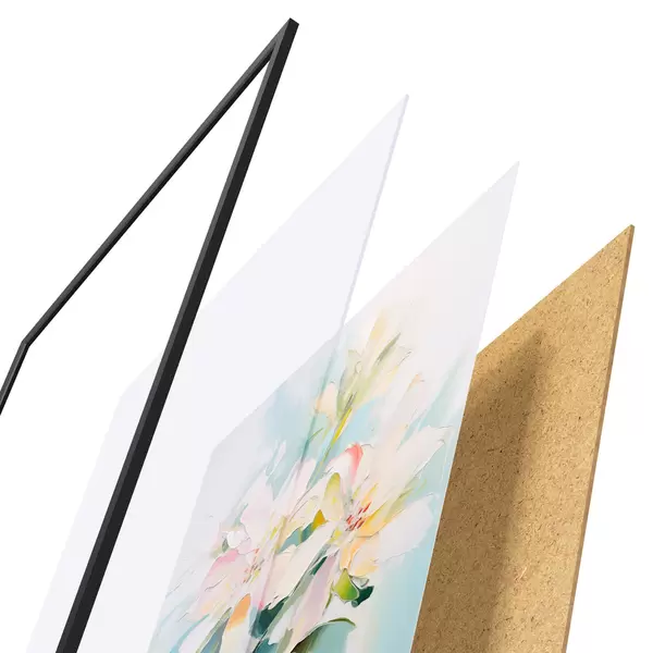 El póster consta de marco, plexiglás, imagen impresa y soporte de aglomerado. El póster puede colgarse inmediatamente en la pared gracias a los soportes de la parte posterior.